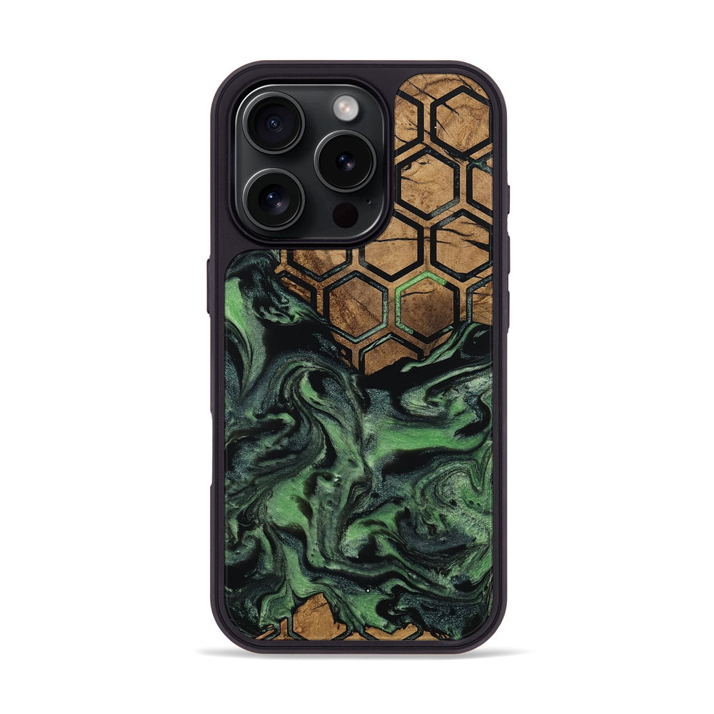 West has a rich Maple wood base featuring a warm, natural tone. It is beautifully paired with a striking hexagon pattern that contrasts with the smooth swirls of green and black.