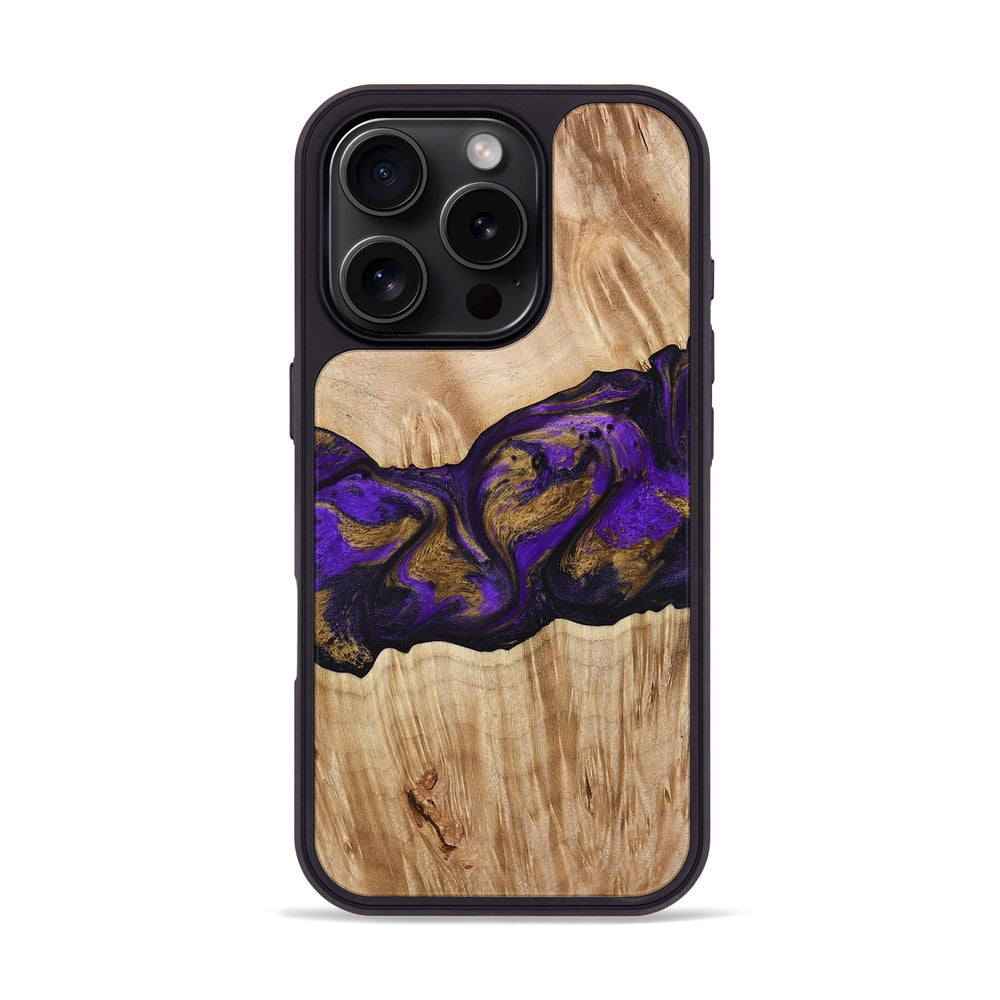 Almira features a beautiful pattern in the Maple wood, highlighted by rich purple and gold swirls. The lighter wood grain creates a warm contrast, adding depth to its design.