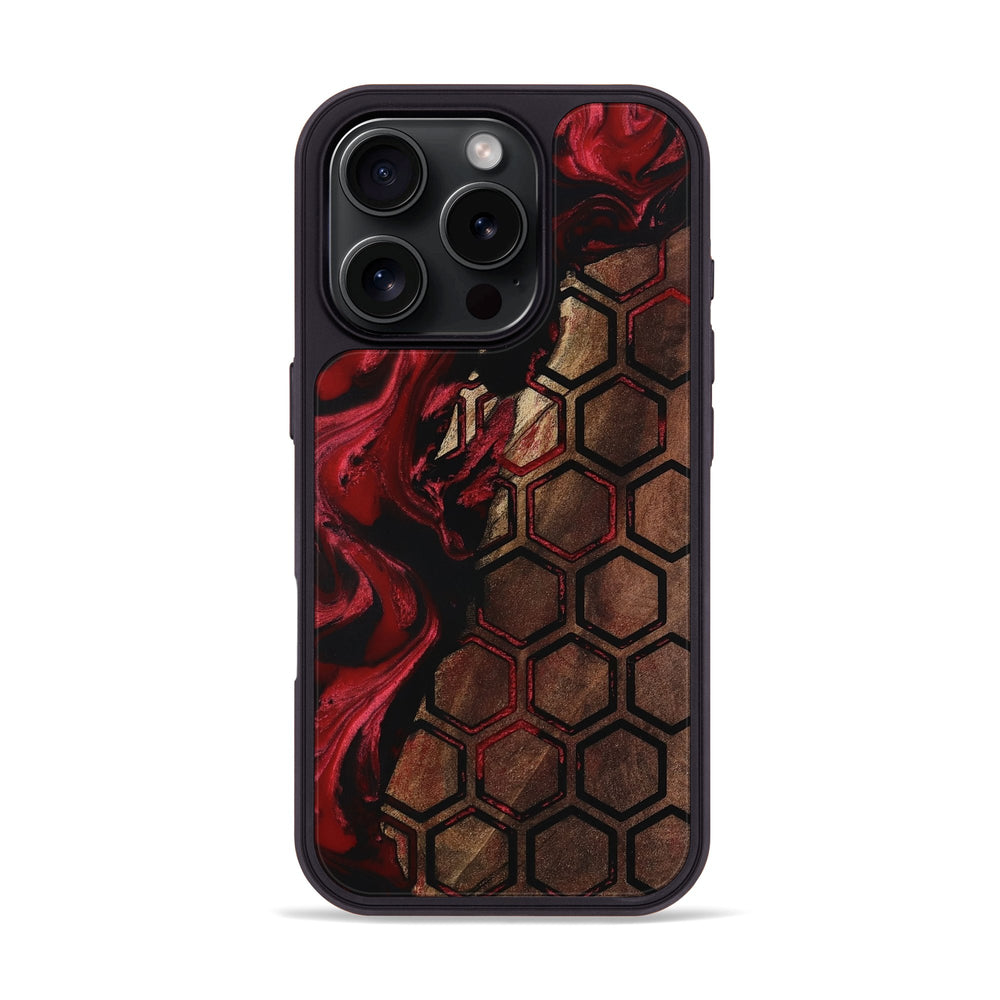 Carlie has a warm, rich Maple wood tone that highlights its natural beauty. It features a striking pattern of hexagons along one side, adding an interesting contrast to the flowing red details.