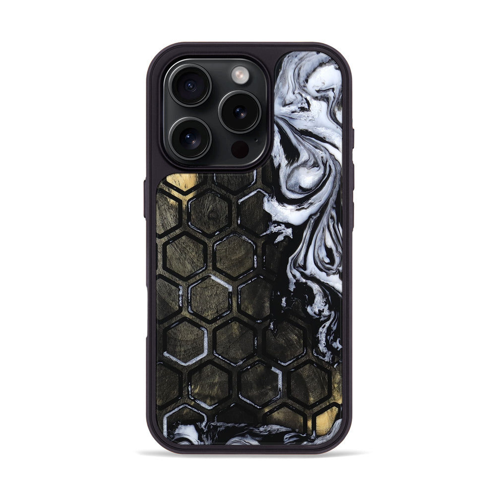 Isadore has a striking contrast of warm Buckeye wood with bold black and white patterns. The hexagonal shapes create a harmonious and modern look, drawing the eye across the design.