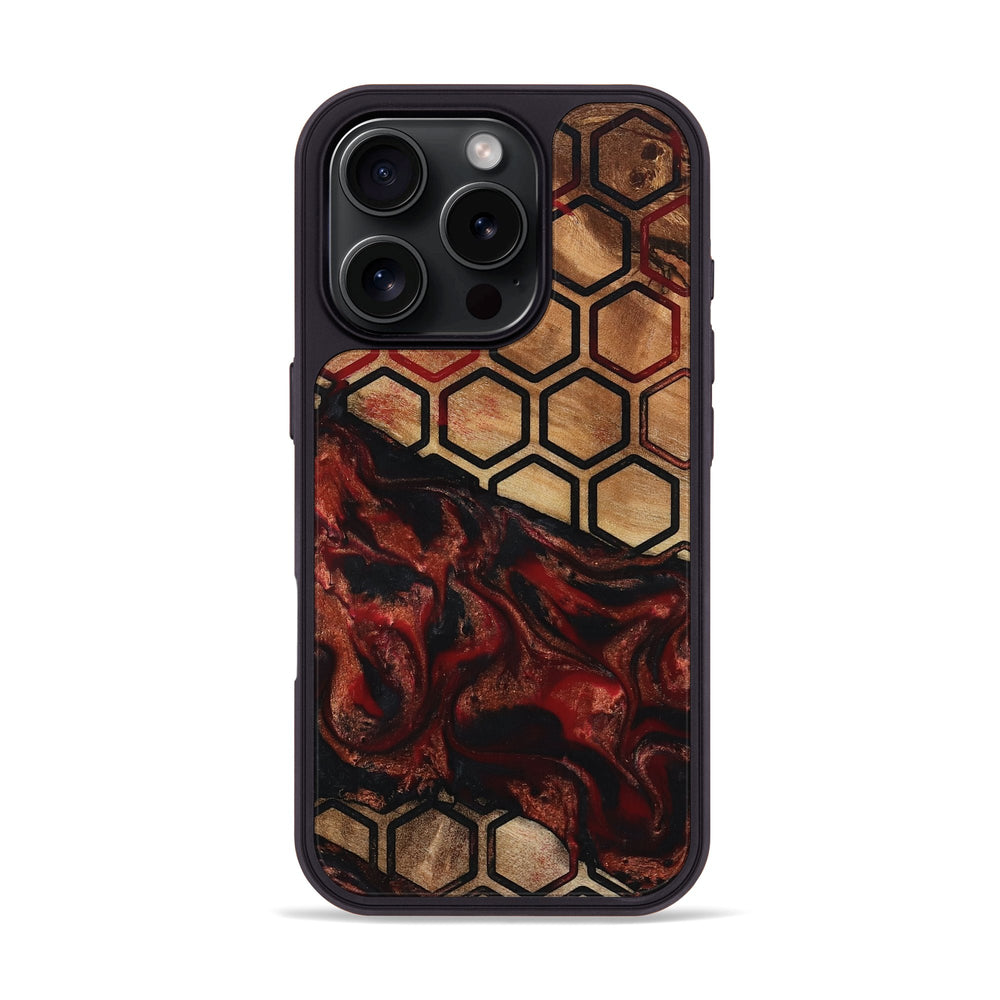 Jeri has a warm maple wood base accented with bold, swirling red and black patterns. The artwork features a striking hexagonal pattern that adds a unique touch to its design.
