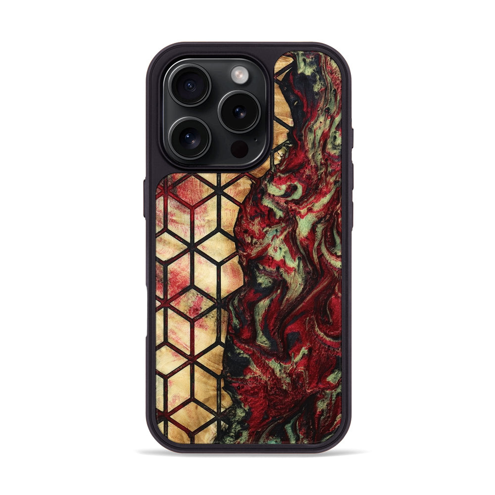 Watson has a striking pattern of hexagons that create a unique contrast with swirling red and green tones. The smooth wood surface highlights its natural beauty and rich color variations.