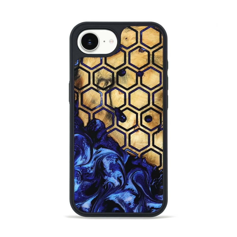 Emilie has a warm wood finish with beautiful swirls of deep blue and gold. The pattern of hexagons creates a striking contrast against the flowing colors, giving it a unique and lively look.