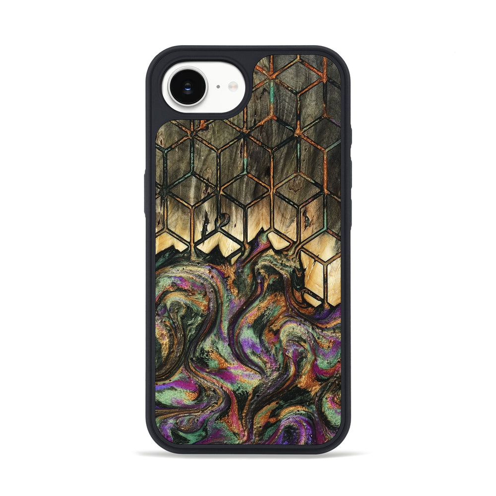 Gerardo has a rich, swirling pattern with vibrant colors of purple, green, and gold. It features a modern hexagonal design that contrasts beautifully with the natural wood grain.