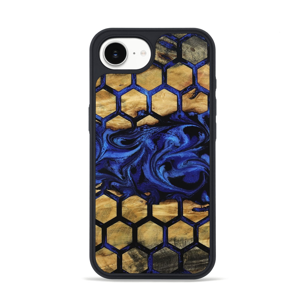Nyah has a warm, natural look with rich shades of gold and brown in its Buckeye wood. It features a striking honeycomb pattern in a vibrant blue, adding a unique and modern touch.