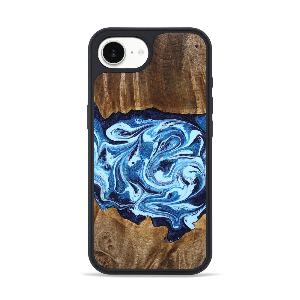 Stefani has a warm, rich maple wood finish that highlights its natural grains. The piece features a captivating swirl of blue and white tones, adding a gentle contrast to the wood’s earthy texture.