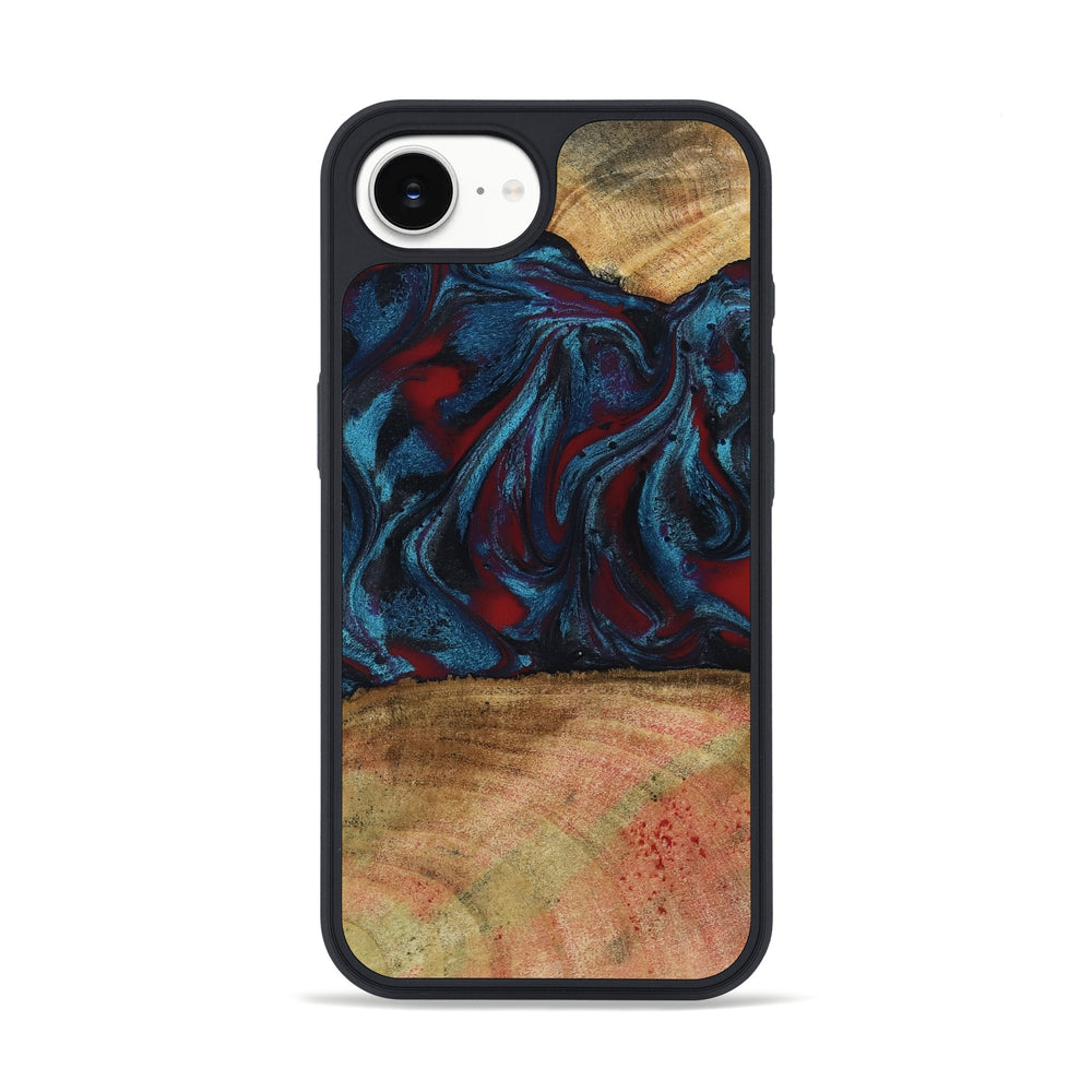Trena has a rich blend of blue and deep red swirling patterns, creating a dynamic look. The warm tones of the Buckeye wood add a beautiful contrast to the vibrant colors.