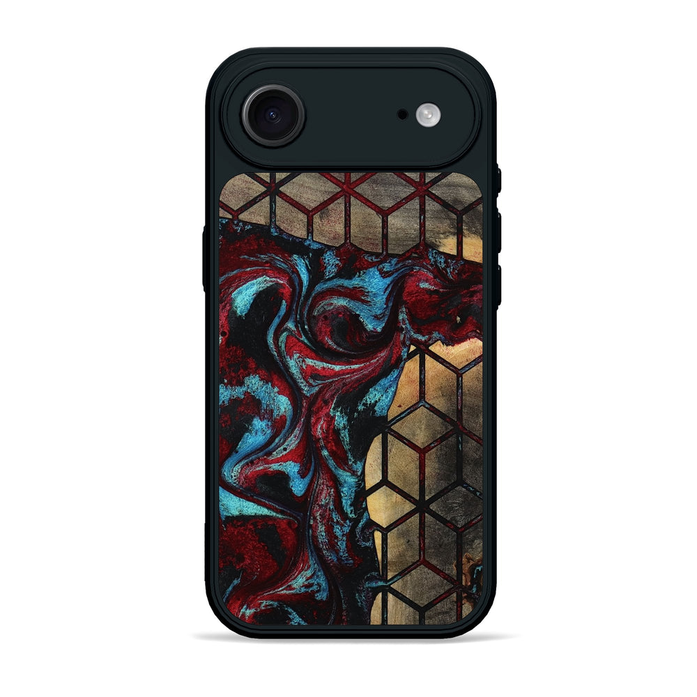 Casimer has a striking blend of deep reds and blues swirling against a backdrop of warm wood tones. The pattern of hexagons adds a playful touch, enhancing its unique visual appeal.