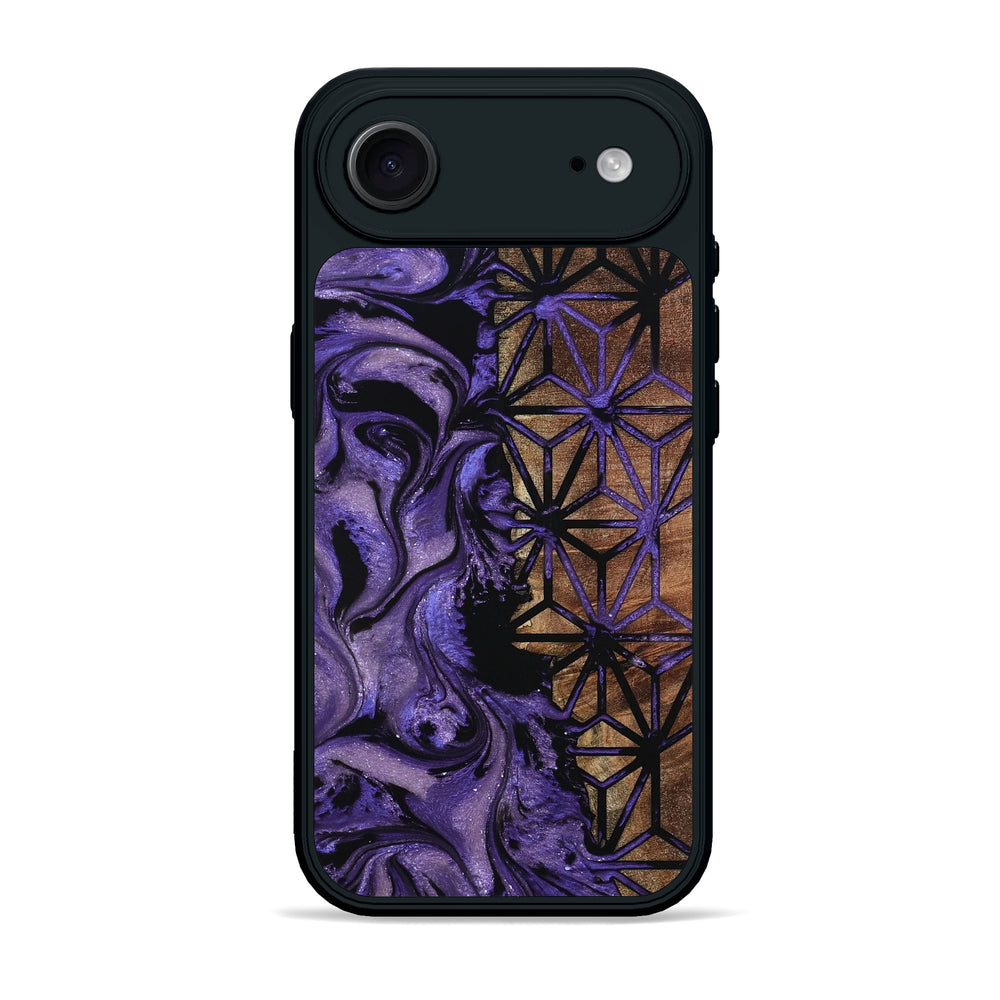 Matie has beautiful Maple wood with a warm, natural tone. The design features a flowing, purple swirl pattern next to a geometric arrangement, creating an interesting contrast.