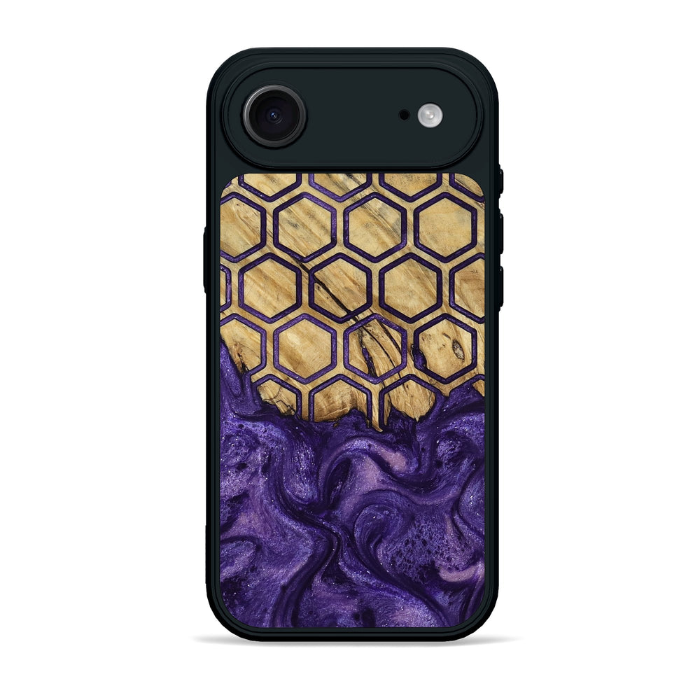 Regan has a unique pattern with honeycomb shapes arranged over a warm, golden wood background. The deep purple swirls at the bottom add a striking contrast, creating a balanced yet intriguing look.