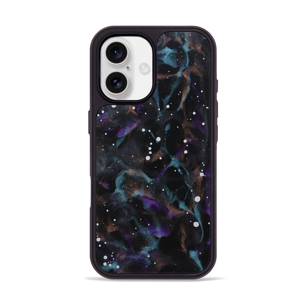 Aric has a deep black background with swirling shades of blue, purple, and hints of bronze. It features white speckles scattered throughout, resembling stars in a night sky.