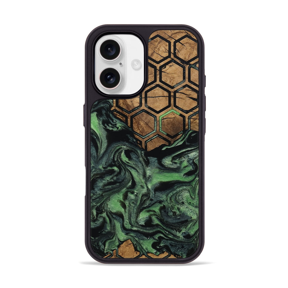 West has a rich Maple wood base featuring a warm, natural tone. It is beautifully paired with a striking hexagon pattern that contrasts with the smooth swirls of green and black.