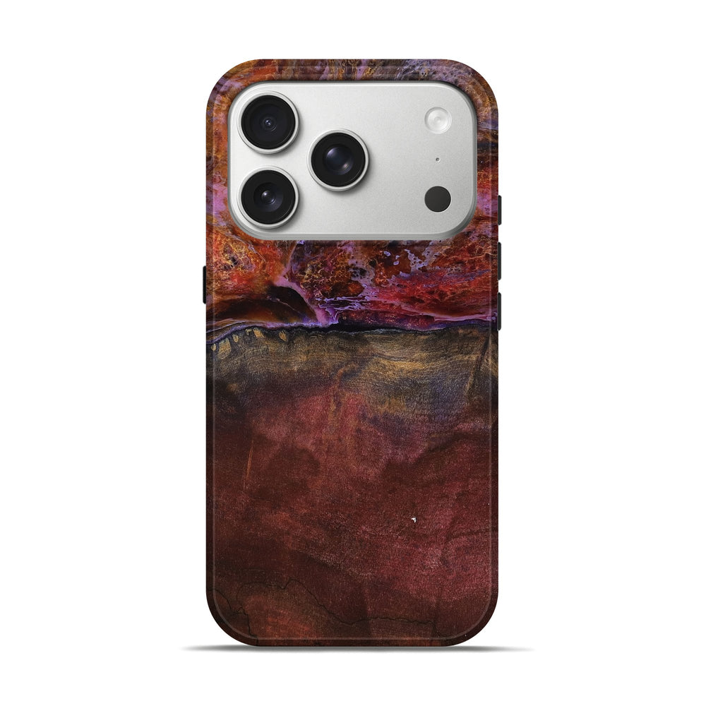 Our Live Edge cases are made from an amazing combination of stabilized wood burl and colored resin. Our stabilization process hardens the wood to protect against cracks and breaks. We do every step of the process at our shop in Northern Indiana. Perfectly fits the iPhone 17 Pro.
