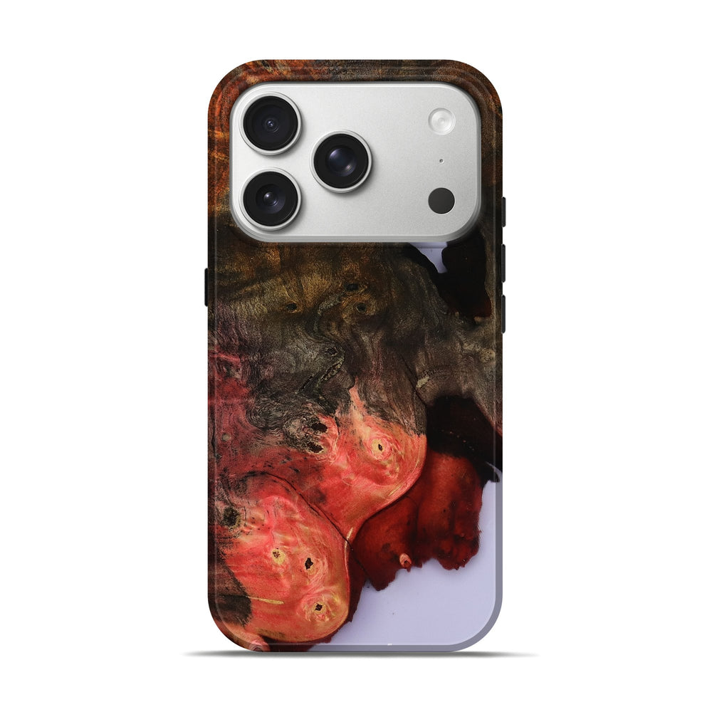 Our Live Edge cases are made from an amazing combination of stabilized wood burl and colored resin. Our stabilization process hardens the wood to protect against cracks and breaks. We do every step of the process at our shop in Northern Indiana. Perfectly fits the iPhone 17 Pro.
