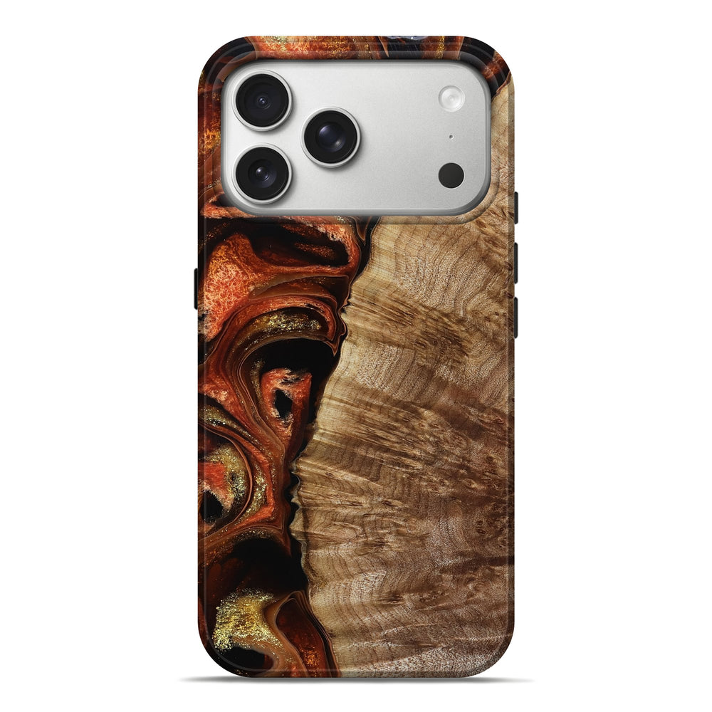 Our Live Edge cases are made from an amazing combination of stabilized wood burl and colored resin. Our stabilization process hardens the wood to protect against cracks and breaks. We do every step of the process at our shop in Northern Indiana. Perfectly fits the iPhone 17 Pro Max.