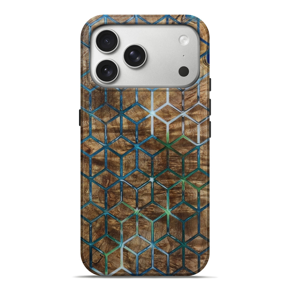 Our Live Edge cases are made from an amazing combination of stabilized wood burl and colored resin. Our stabilization process hardens the wood to protect against cracks and breaks. We do every step of the process at our shop in Northern Indiana. Perfectly fits the iPhone 17 Pro Max.