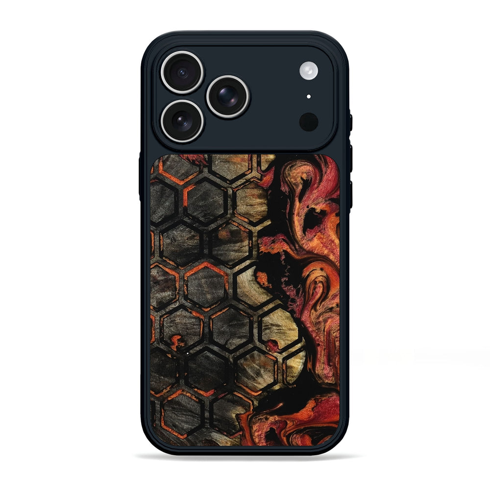 Aaden has warm tones of red and gold flowing around a pattern of hexagons. Its unique design blends natural wood with dynamic colors for an eye-catching look.