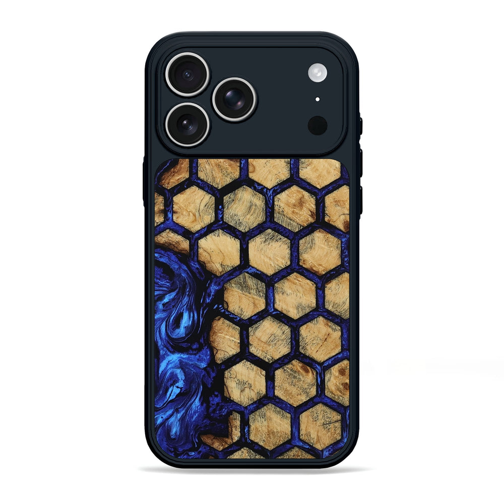 Alice has a warm, golden hue with a unique honeycomb pattern that adds interest. The rich texture of the wood contrasts beautifully with deep blue swirls surrounding it.
