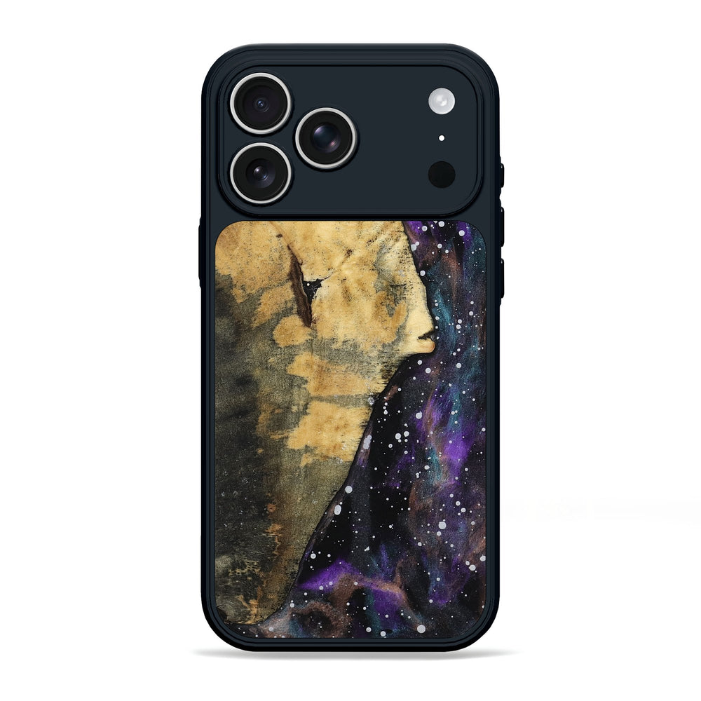 Callen has beautiful patterns that resemble swirling galaxies with deep purples and hints of blue. Its surface features natural wood grain that adds warmth and character, creating a striking contrast with the cosmic colors.