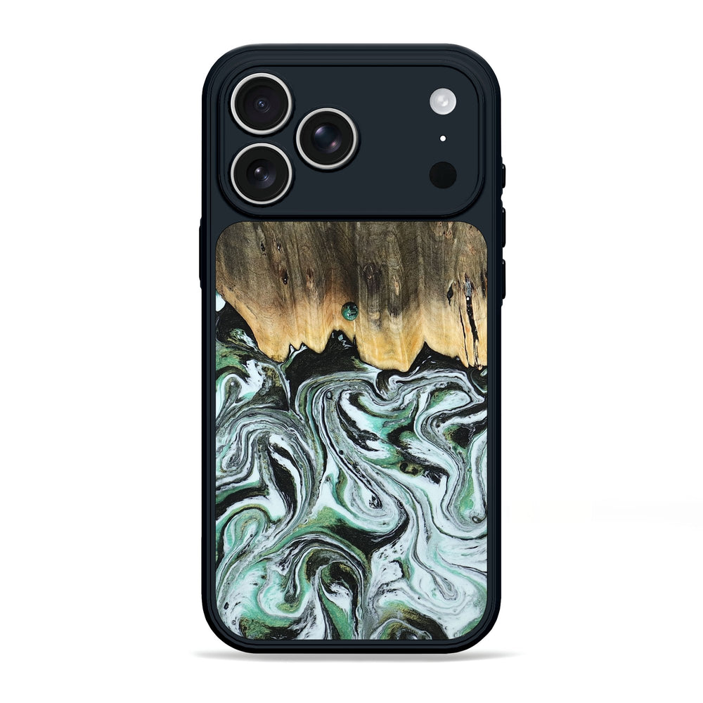 Cecily has a warm, rich wood grain at the top, blending into swirling patterns of green and white below. The design creates a smooth transition from the earthy tones of the wood to the vibrant colors, giving it a unique flow.