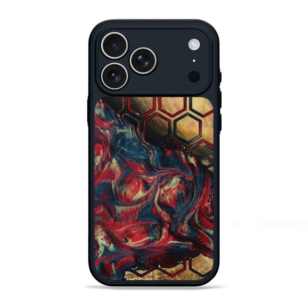 Chante has a beautiful mix of deep reds, blues, and golds swirling together. It features a striking honeycomb pattern that adds a unique touch to the natural wood.