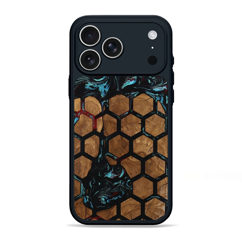 Hakeem features a beautiful pattern of hexagons made from warm maple wood, creating a natural and inviting look. The soft, earthy tones of the wood contrast nicely with the swirls of dark colors above, adding depth to the piece.