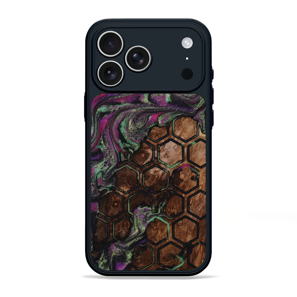 Janene has a beautiful blend of rich maple wood with a striking honeycomb pattern. Its colors swirl in shades of purple and green, creating a vibrant and dynamic look.