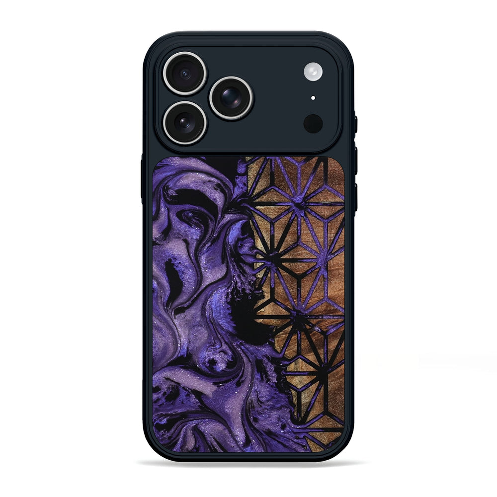 Matie has beautiful Maple wood with a warm, natural tone. The design features a flowing, purple swirl pattern next to a geometric arrangement, creating an interesting contrast.