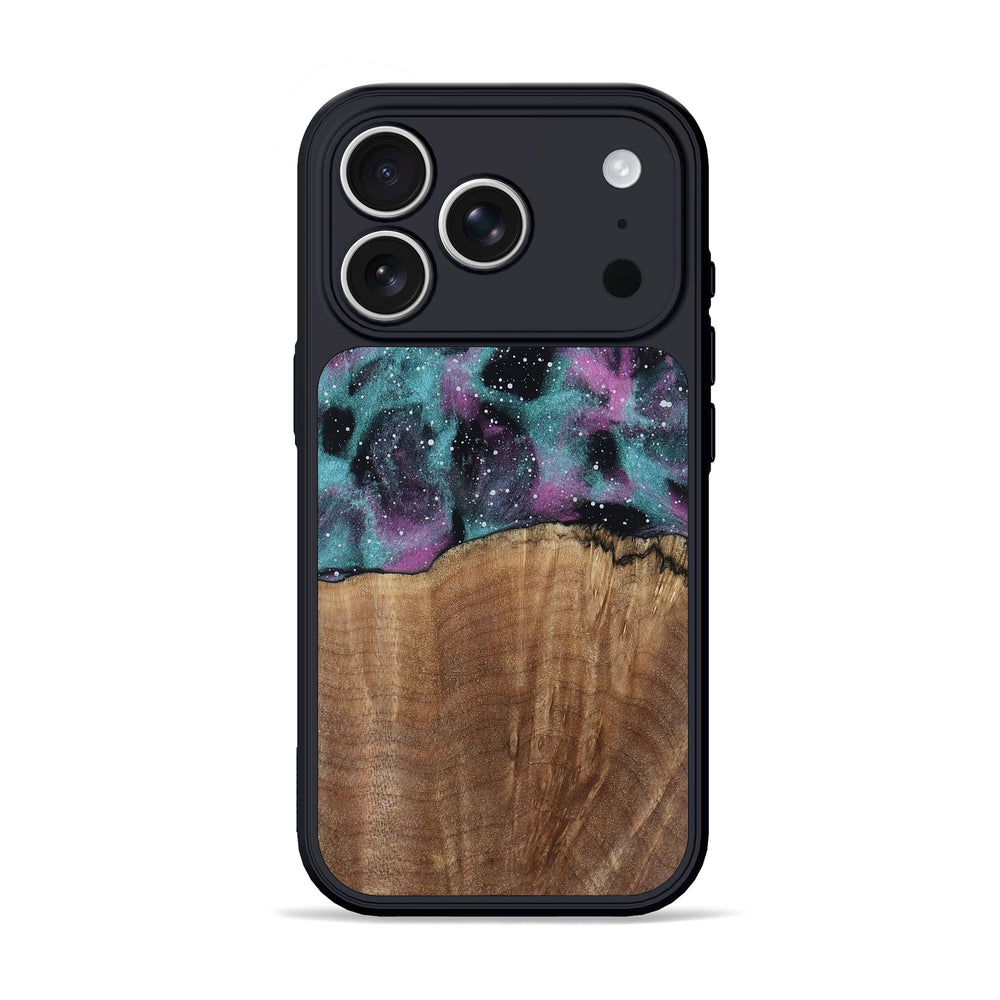 Trina has a beautiful mix of rich maple wood and a vibrant swirl of purple and turquoise. The contrast highlights the unique grain of the wood, creating an eye-catching pattern.