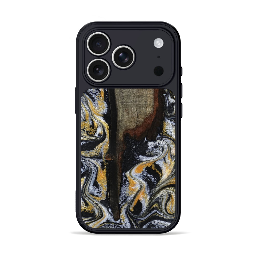 Marlee has a smooth surface with swirling patterns of black, gold, and white. The natural wood grain adds warmth and character, making it a striking piece of art.