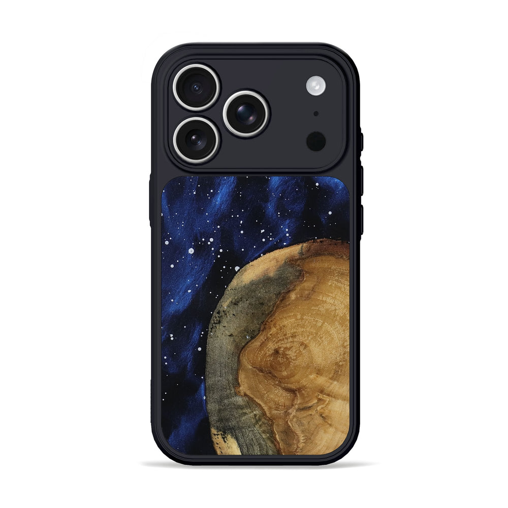 Rubi has a warm, natural finish that highlights the unique patterns in the Buckeye wood. The rich tones create a striking contrast with the deep blue background, giving it a cosmic feel.
