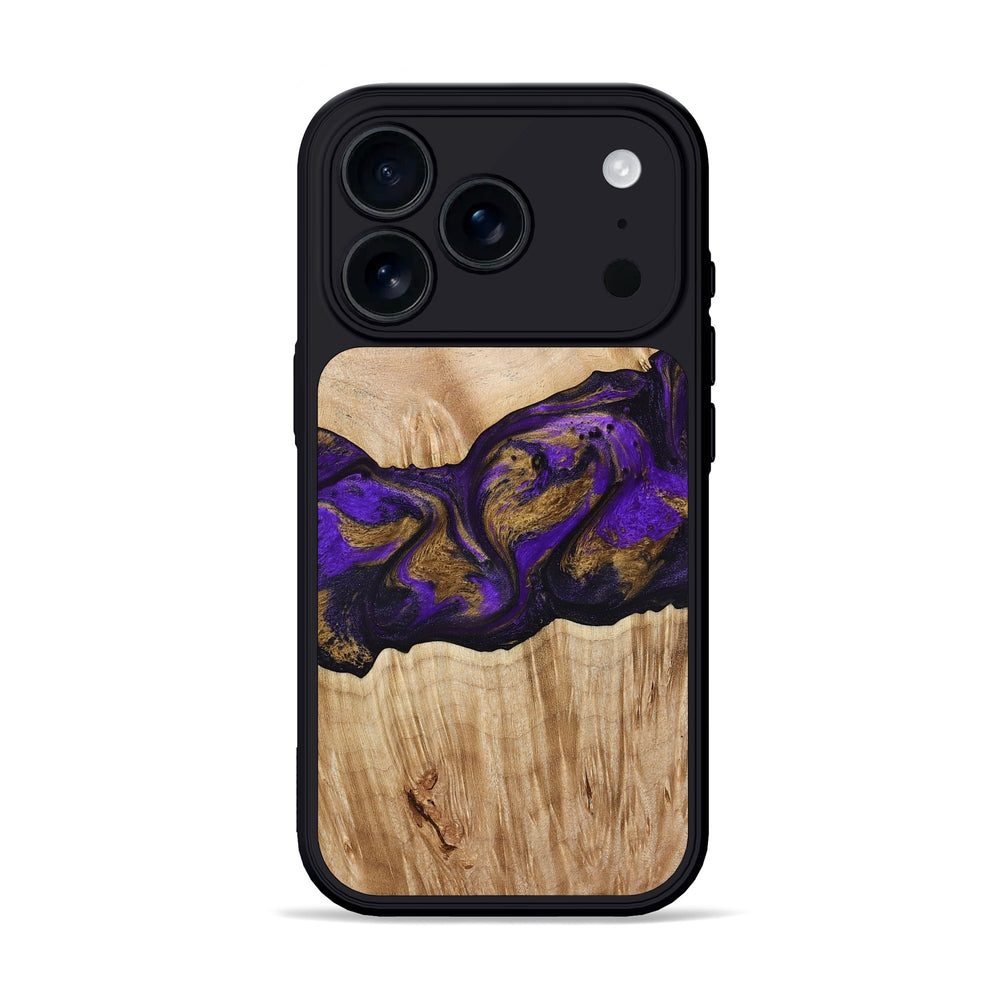 Almira features a beautiful pattern in the Maple wood, highlighted by rich purple and gold swirls. The lighter wood grain creates a warm contrast, adding depth to its design.