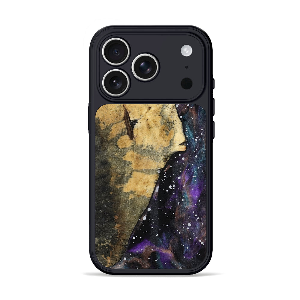 Callen has beautiful patterns that resemble swirling galaxies with deep purples and hints of blue. Its surface features natural wood grain that adds warmth and character, creating a striking contrast with the cosmic colors.