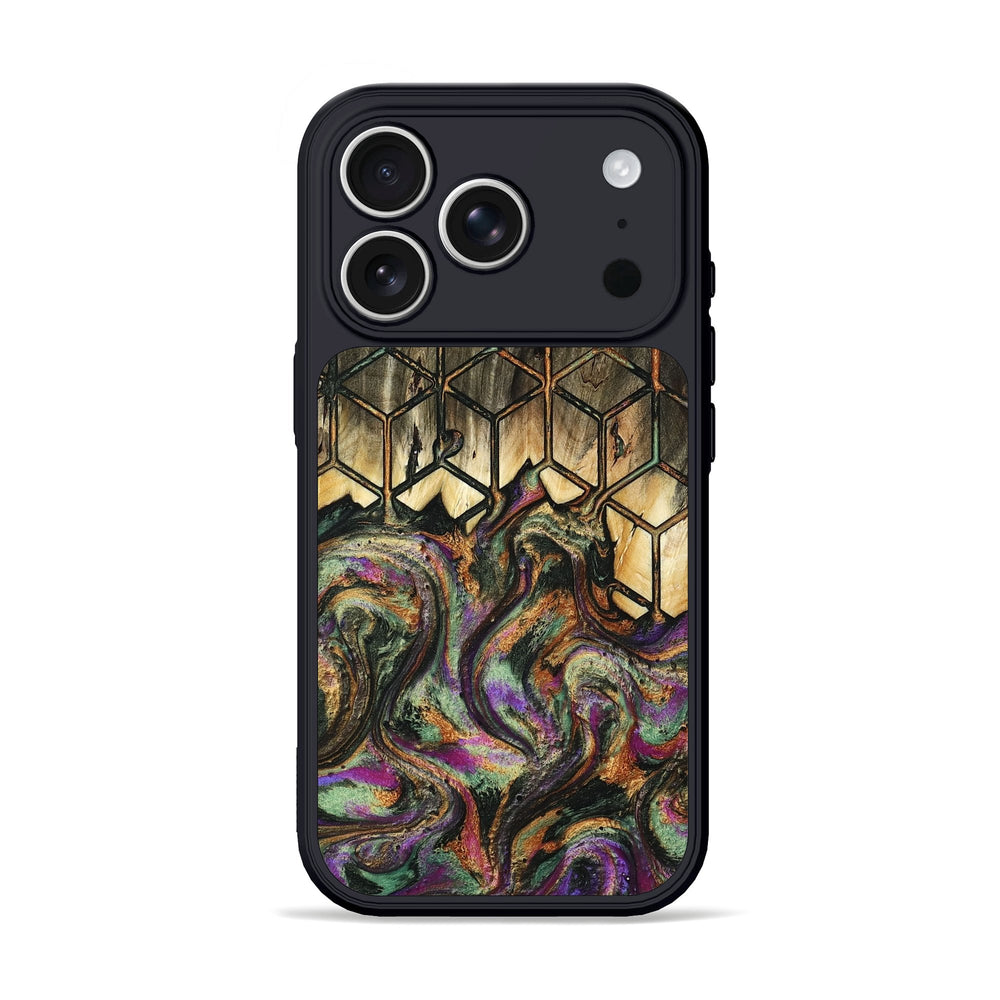 Gerardo has a rich, swirling pattern with vibrant colors of purple, green, and gold. It features a modern hexagonal design that contrasts beautifully with the natural wood grain.