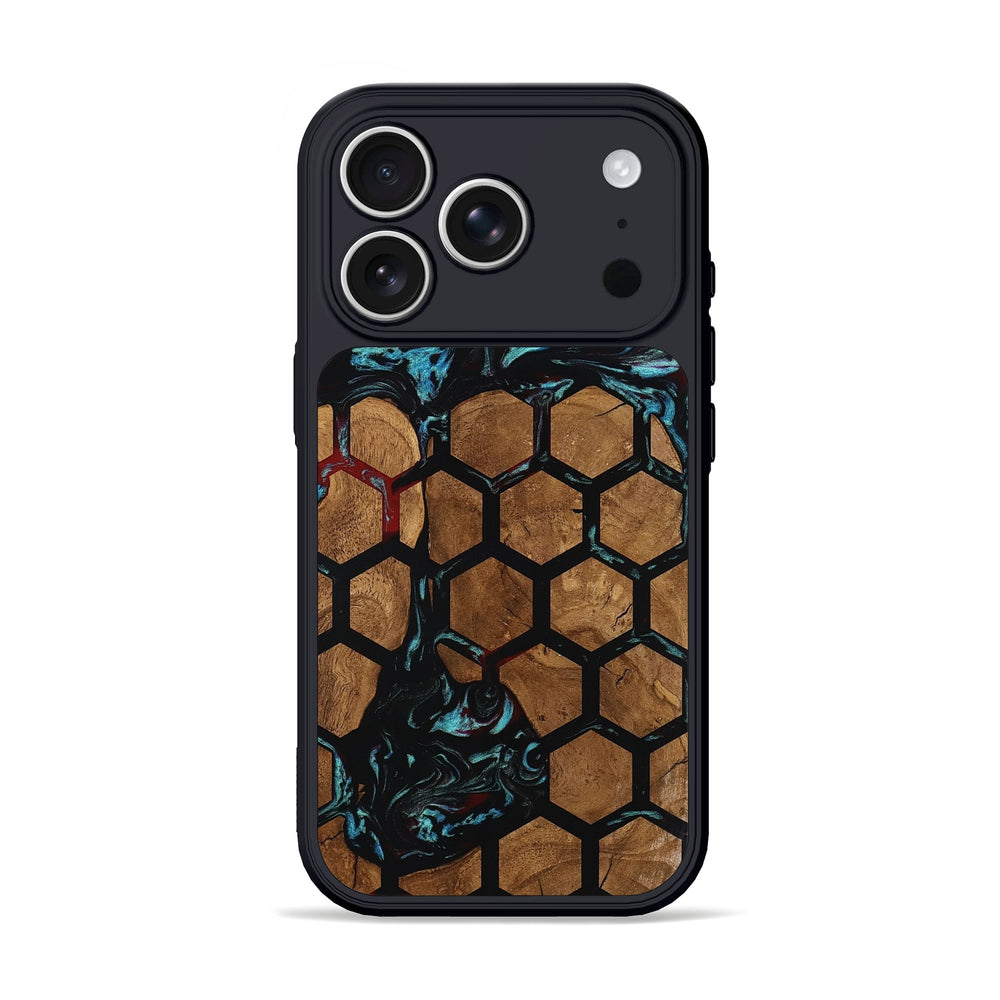Hakeem features a beautiful pattern of hexagons made from warm maple wood, creating a natural and inviting look. The soft, earthy tones of the wood contrast nicely with the swirls of dark colors above, adding depth to the piece.