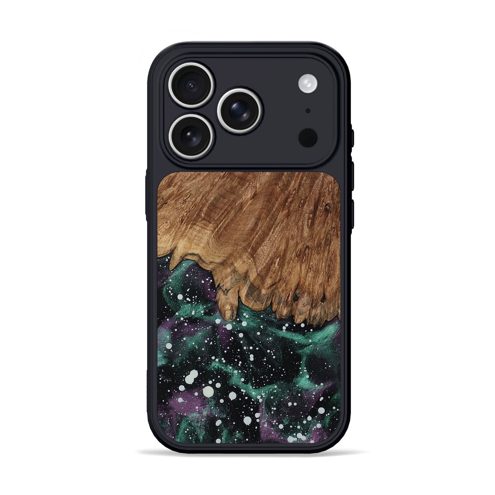 Jakob has rich, warm tones that highlight its natural grain. The smooth surface flows into a cosmic backdrop of dark greens, purples, and white dots.