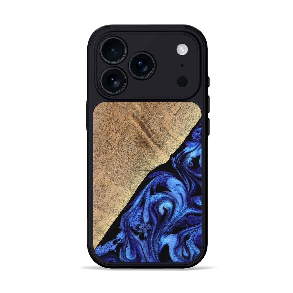Jaylan has a warm, light maple wood finish that showcases its natural grain. It features bold swirls of deep blue, creating a striking contrast and a dynamic visual pattern.