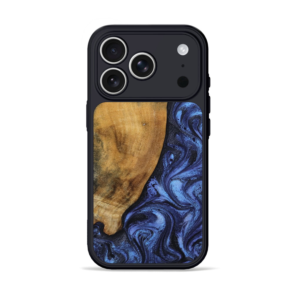 Naomi has smooth, warm wood tones that contrast beautifully with rich, swirling blue patterns. The gentle curves and unique grain of the wood create a soft, inviting look.