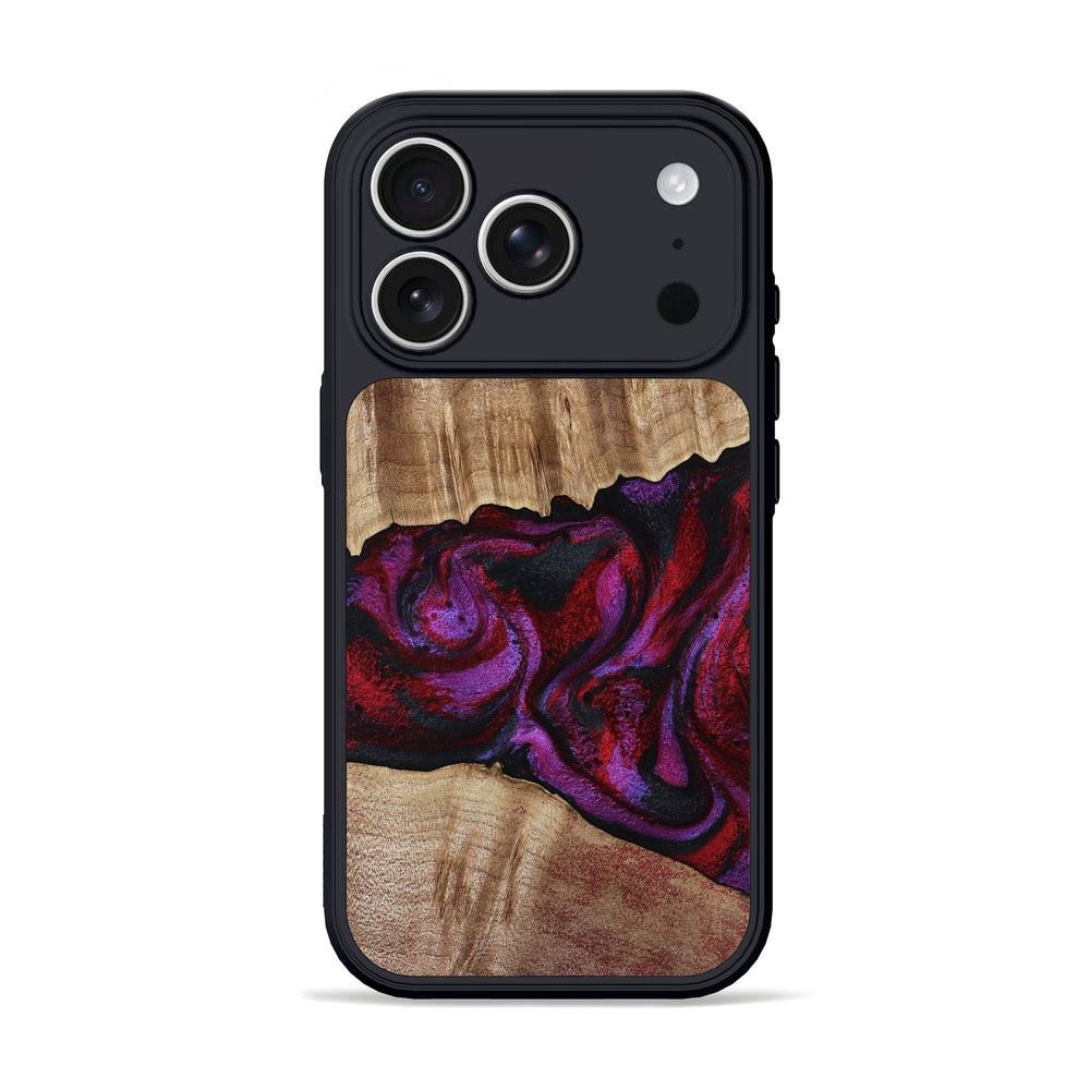 Shyann has a smooth surface with warm, light tones of Maple wood. It features bold, swirling patterns in deep red and purple that create a striking contrast.