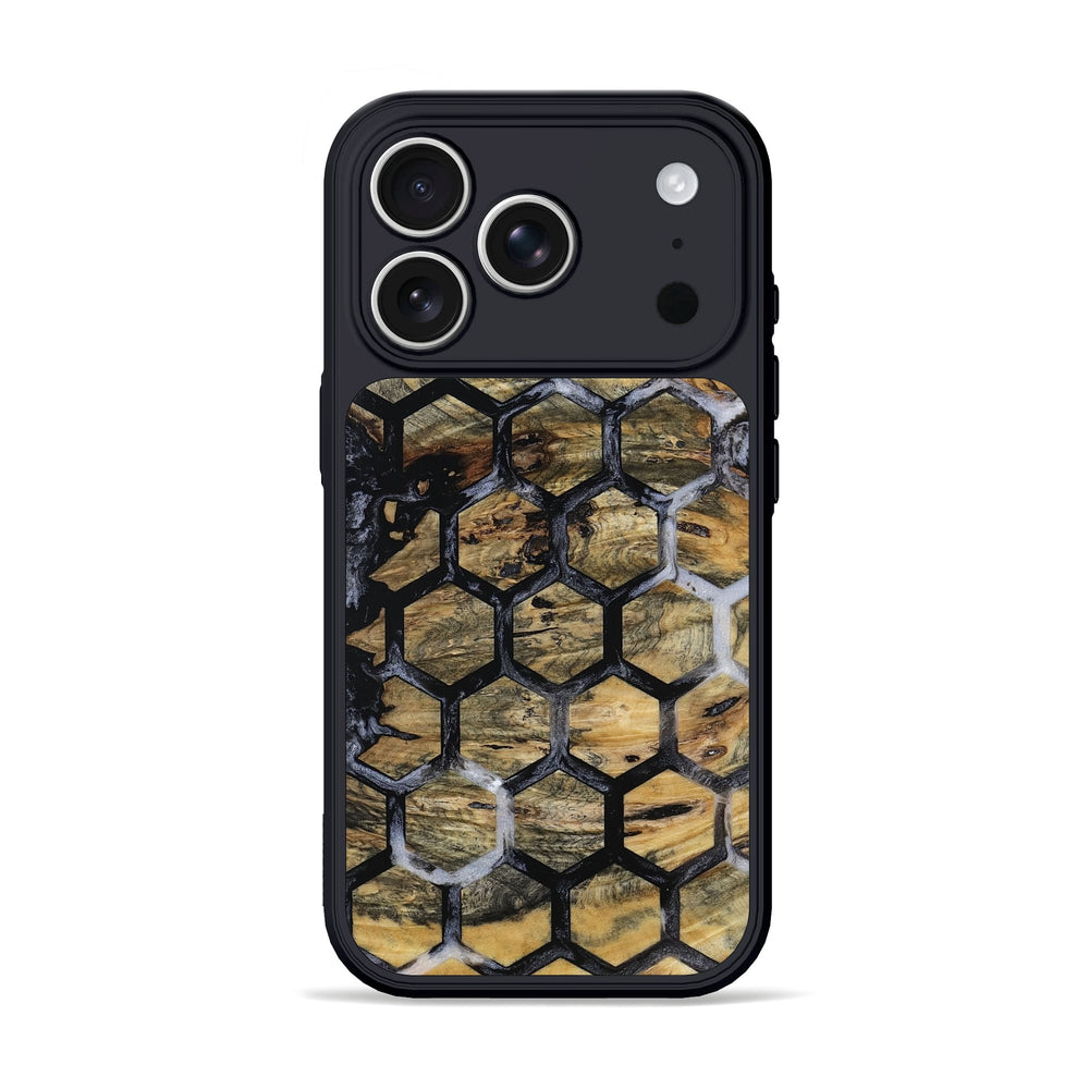 Syble has a striking hexagonal pattern that creates a unique, organized look. Its warm, natural wood tones stand out against a dark background, highlighting the beauty of the wood.