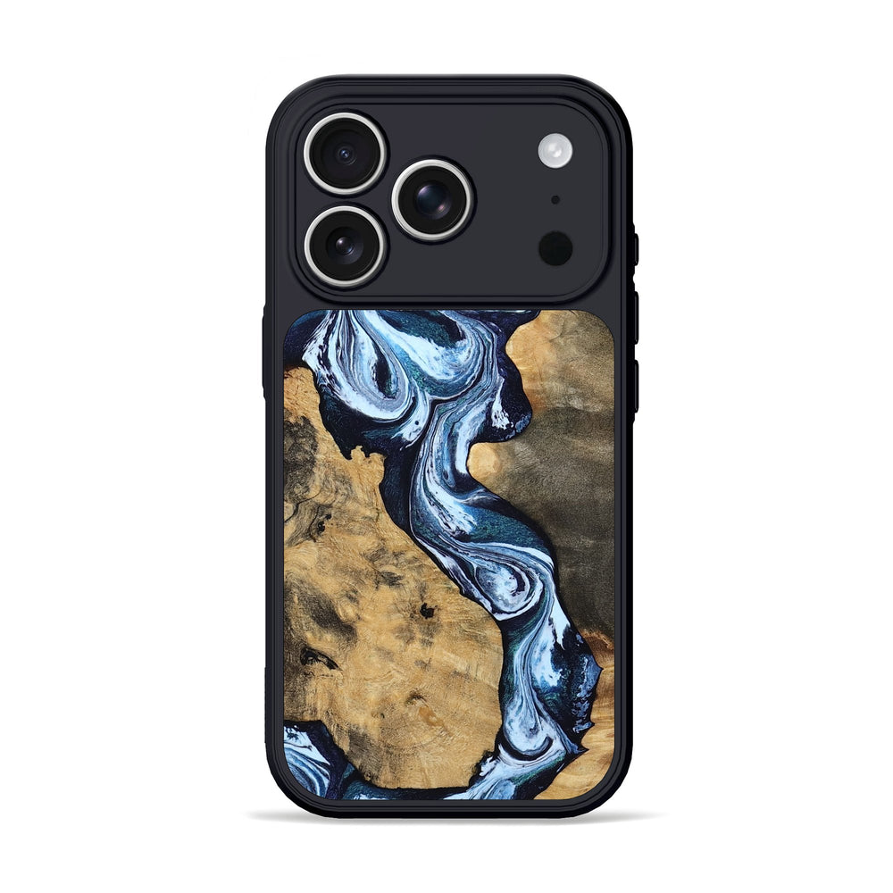 Taylor has beautiful swirling patterns in deep blues and whites against natural Buckeye wood. The contrasting colors highlight the unique grain and texture of the wood, creating a striking visual effect.
