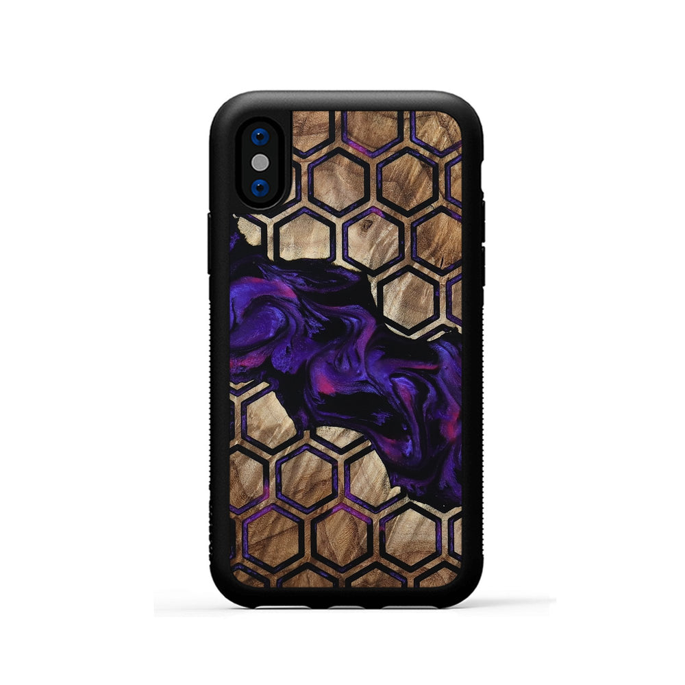 Ashtyn has a beautiful mix of warm maple wood tones and vivid purple swirls. Its hexagonal pattern adds a modern touch to the natural wood background.