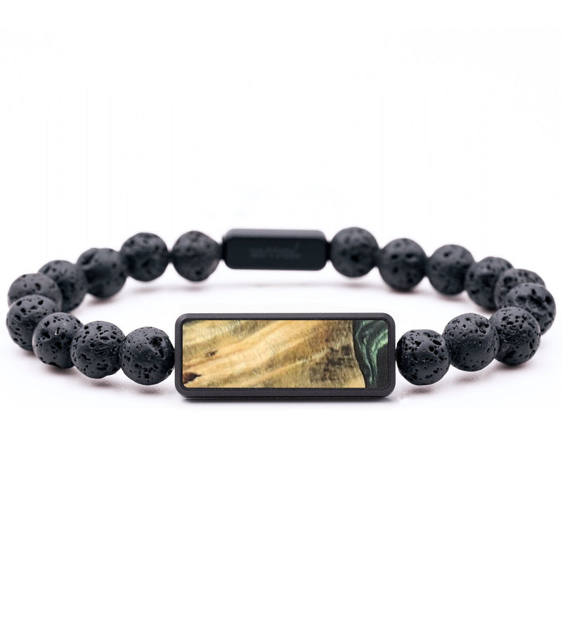 Lava stone beads, anodized aluminum housing, tough elastic band. Small and large sizes. Sweatproof & outdoor ready.