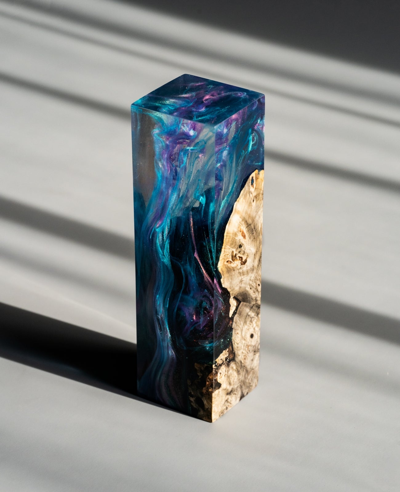 Our Monolith is made from burl wood and resin. We stabilize the wood to help it resist humidity changes, then add resin, dyes and pigments. When the finished part has fully hardened, we cut it to size and polish it to an almost mirror finish.