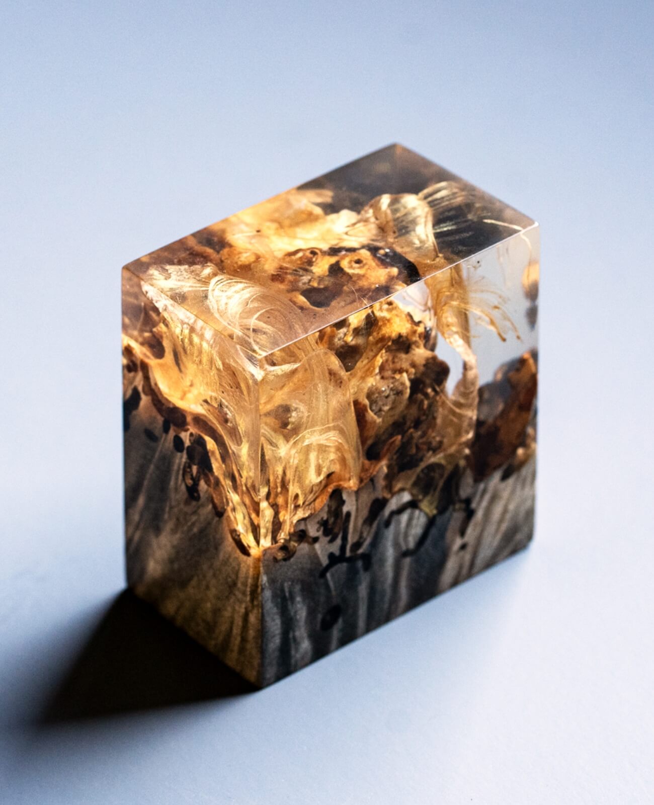 Our Monolith is made from burl wood and resin. We stabilize the wood to help it resist humidity changes, then add resin, dyes and pigments. When the finished part has fully hardened, we cut it to size and polish it to an almost mirror finish.
