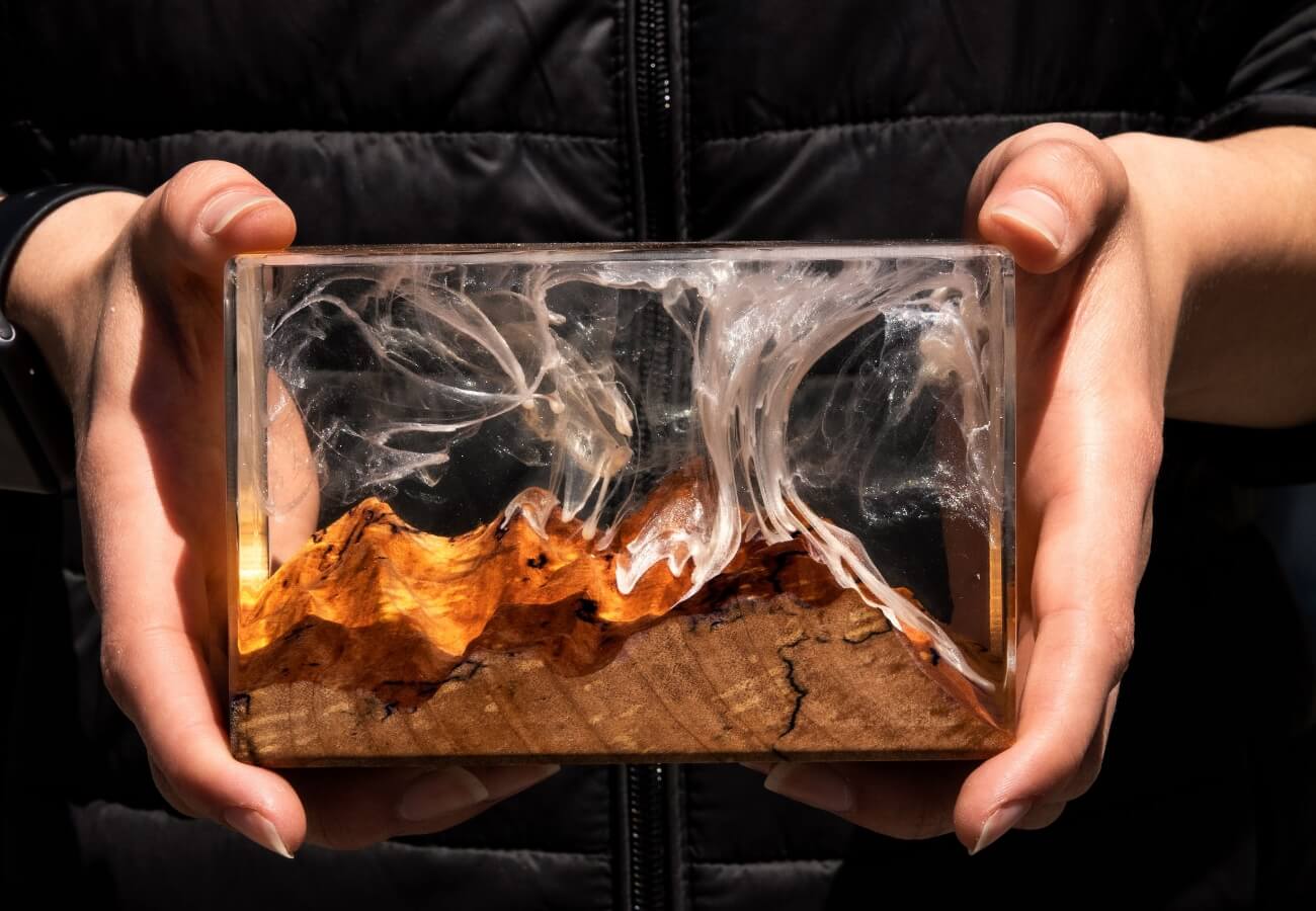 Our Monolith is made from burl wood and resin. We stabilize the wood to help it resist humidity changes, then add resin, dyes and pigments. When the finished part has fully hardened, we cut it to size and polish it to an almost mirror finish.