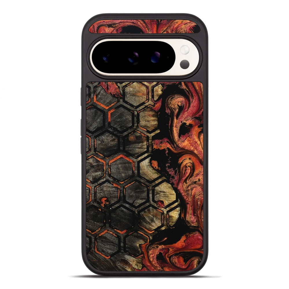 Aaden has warm tones of red and gold flowing around a pattern of hexagons. Its unique design blends natural wood with dynamic colors for an eye-catching look.