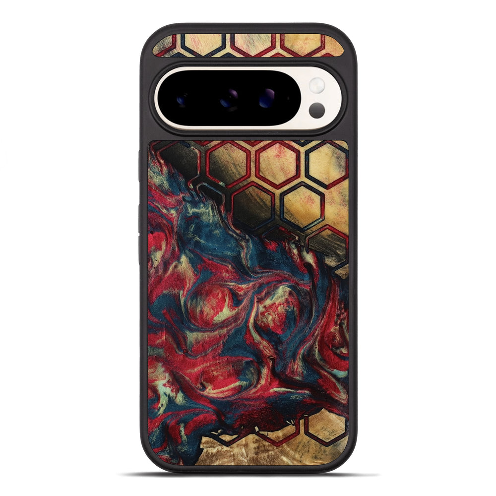Chante has a beautiful mix of deep reds, blues, and golds swirling together. It features a striking honeycomb pattern that adds a unique touch to the natural wood.