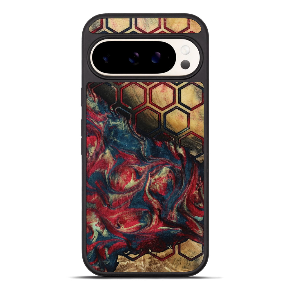 Chante has a beautiful mix of deep reds, blues, and golds swirling together. It features a striking honeycomb pattern that adds a unique touch to the natural wood.