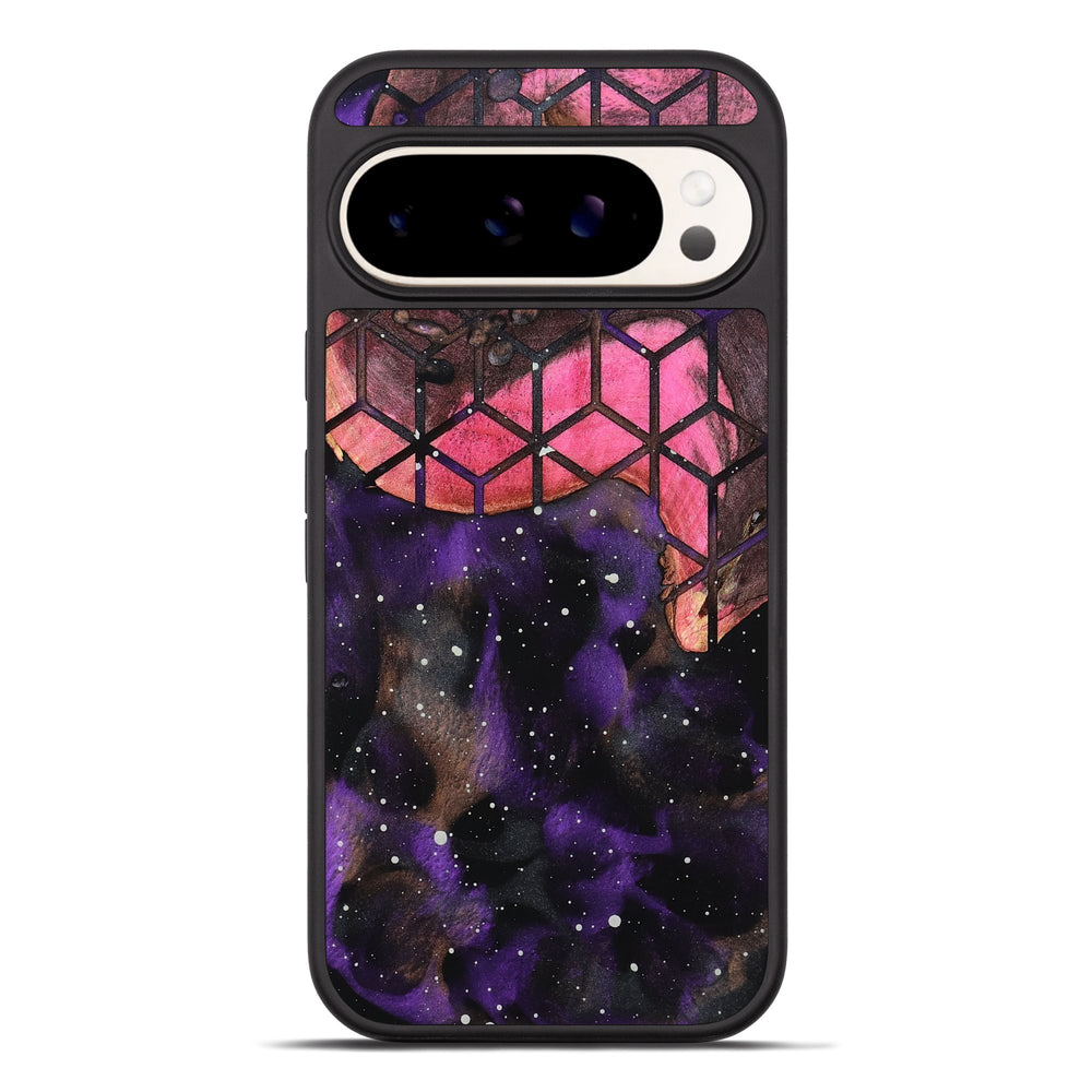 Pete is a vibrant piece of dyed wood featuring a mix of deep purples and pinks. It has a honeycomb pattern overlay that adds an interesting texture to its cosmic design.